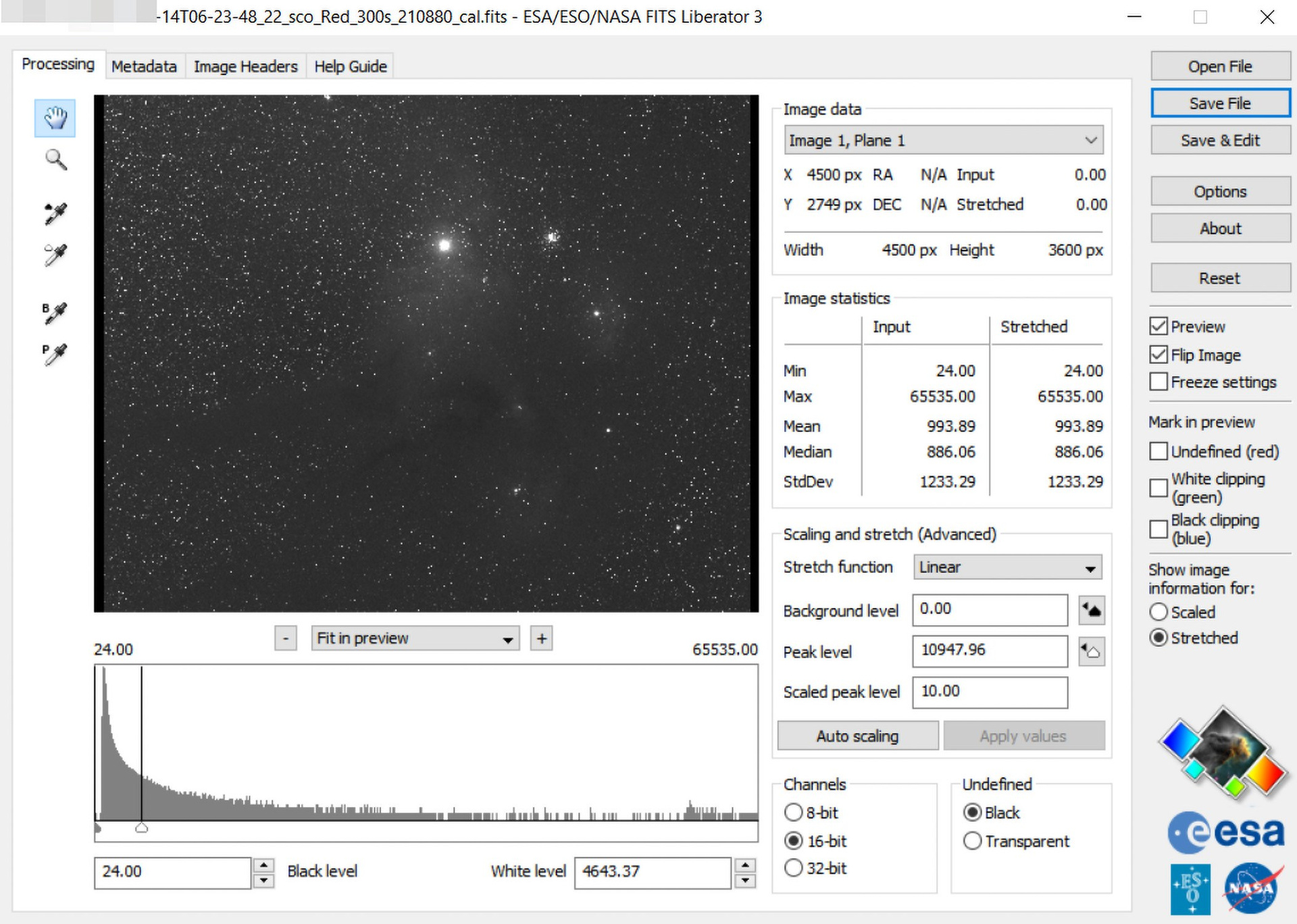 - Лёгкую коррекцию в FITS Liberator с последующей конвертацией в TIFF. Здесь достаточно поправить уровни, чтобы детали изображения были хорошо различимы;