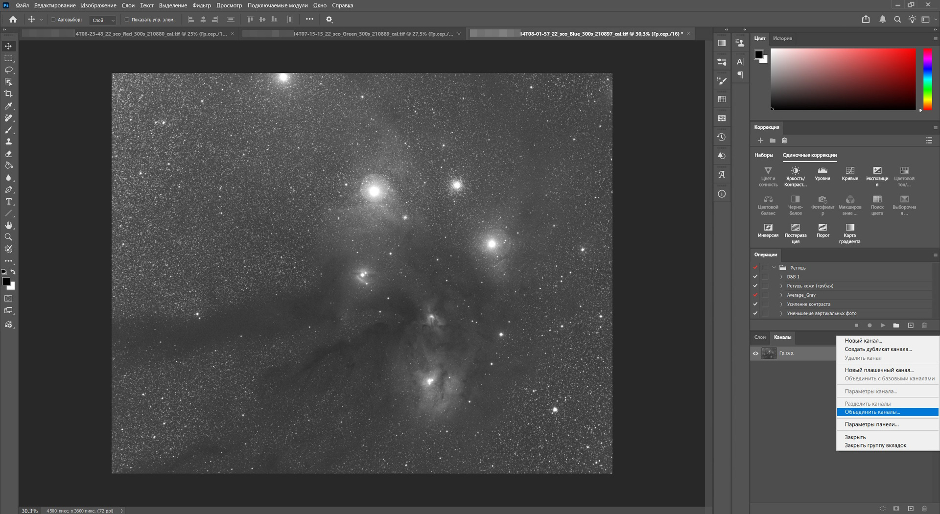 Отредактировали один файл? Сохранили в TIFF. Потом следующий. Продолжайте делать так, пока не проявите как минимум три исходника — Red, Green, Blue. Если в именах файлов не содержатся названия каналов (после съёмки или получения исходников из обсерватории), задайте их вручную.